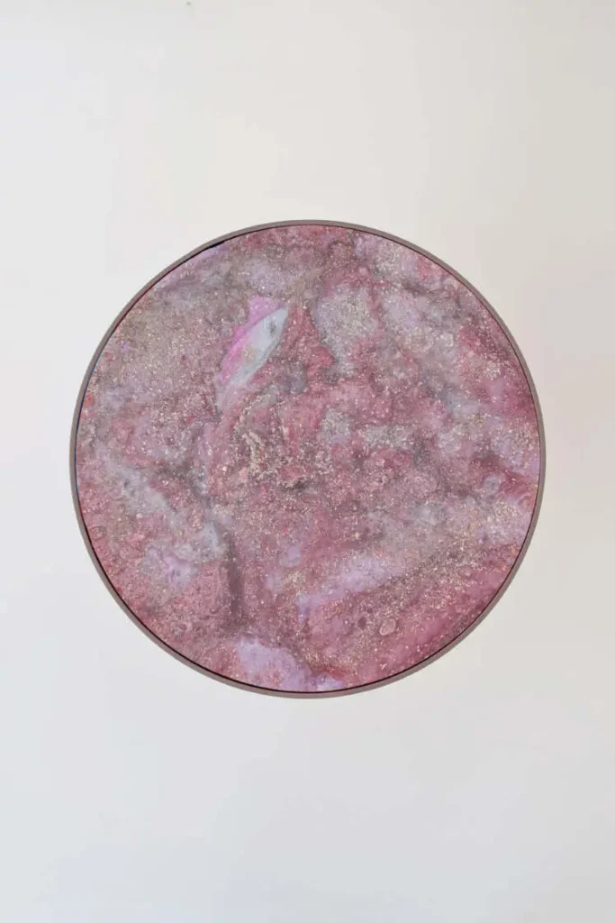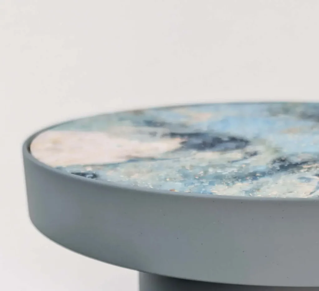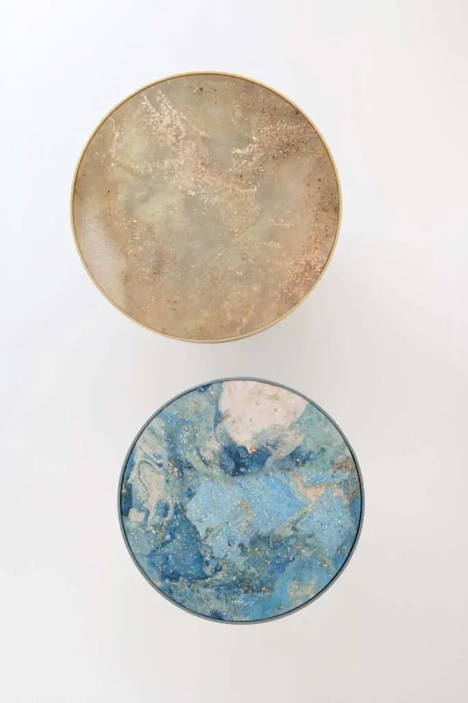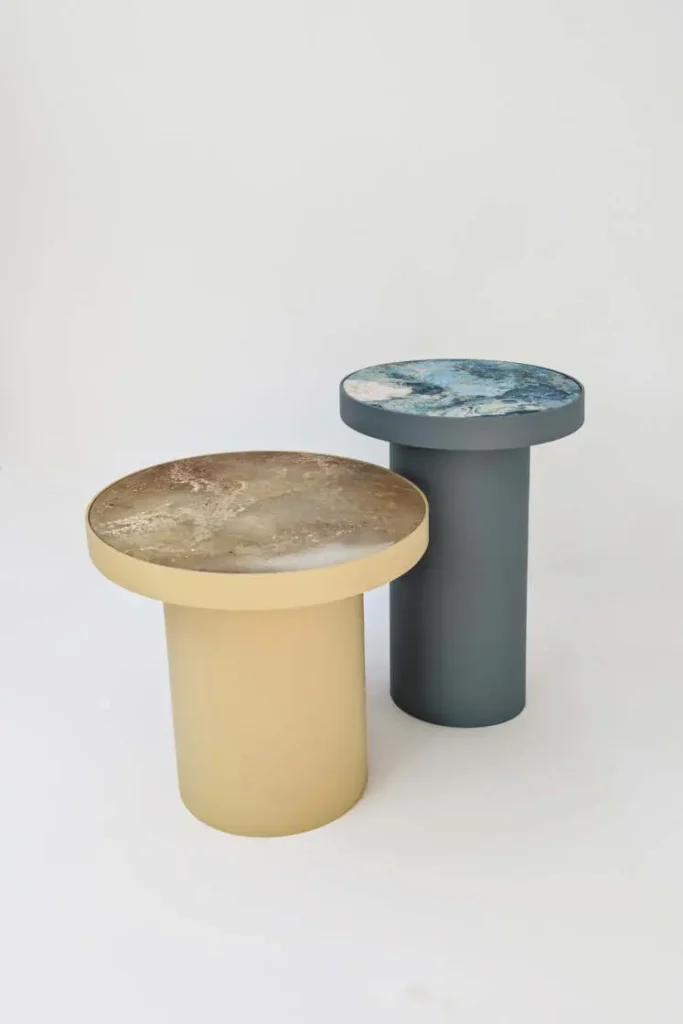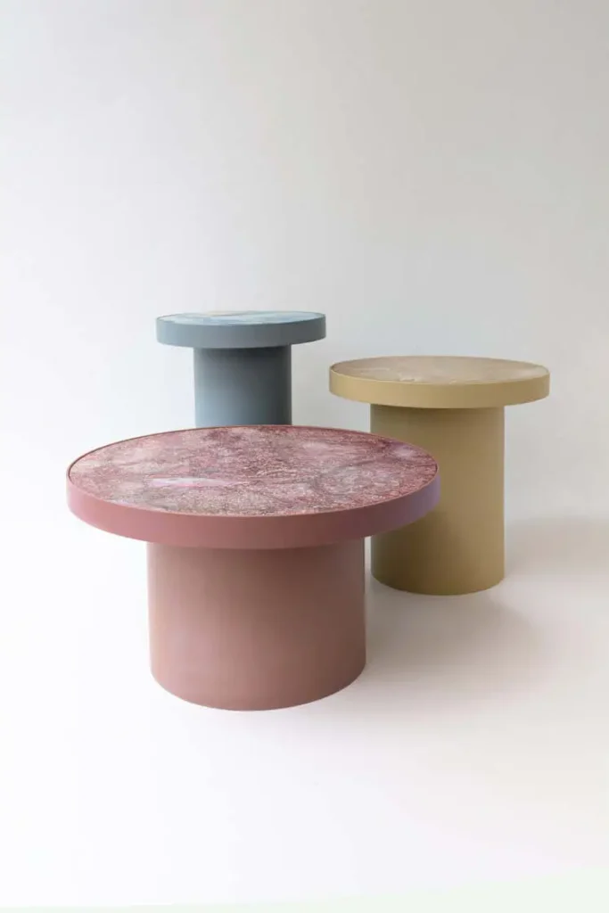 The table tops are made from and dyed with organic matter such as egg and nutshells by shell homage. Large table: Pomegranate with mauve base, medium table: lemon zest with yellow base and small table: azur quarz with dove blue base.