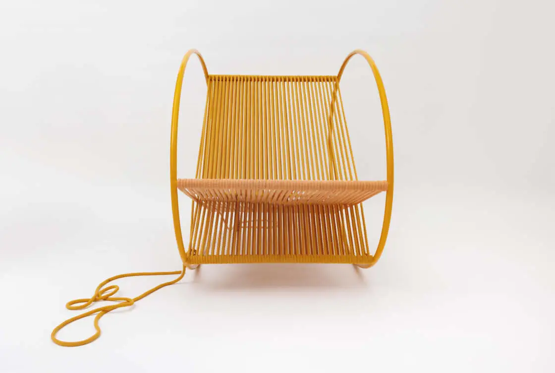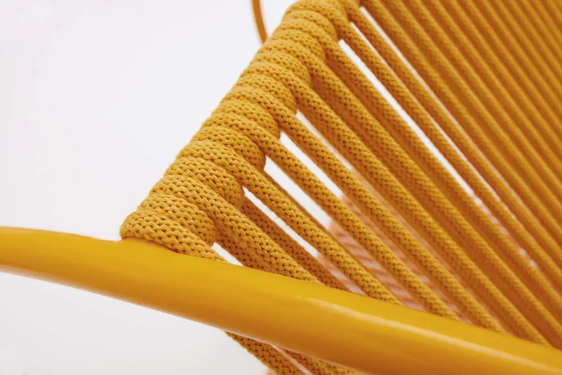 SWAY is a contemporary interpretation of timeless comfort. The chair is crafted from upcycled cotton rope, its recycled fibers hand-woven into rhythmic patterns around powder-coated metal structures that feel both grounded and weightless: sustainable, durable and expressive in form.